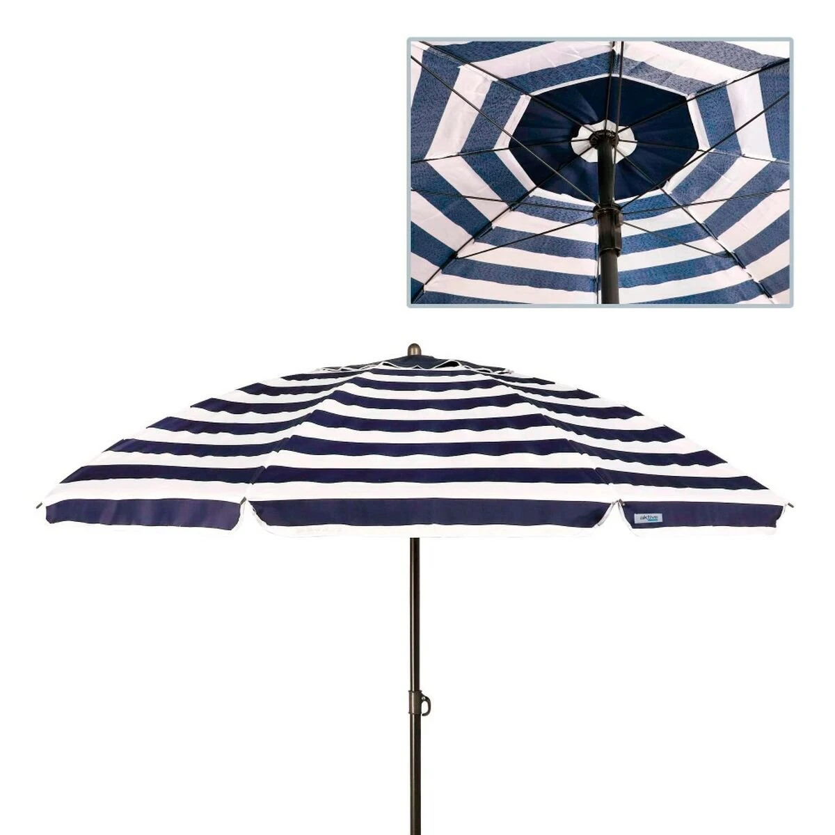 Sombrilla de playa Aktive Beach con diámetro de 240 cm y mástil de 32/32 mm de diámetro con altura fija de 230 cm. Sombrilla fabricada con tejido 100% poliéster de 140 GSM y estructura de metal resistente con 8 varillas. Incluye funda con asa para transportarla y guardarla fácilmente. Con doble techo para facilitar la circulación del viento y diseño marinero a rayas azul marino y blanco.