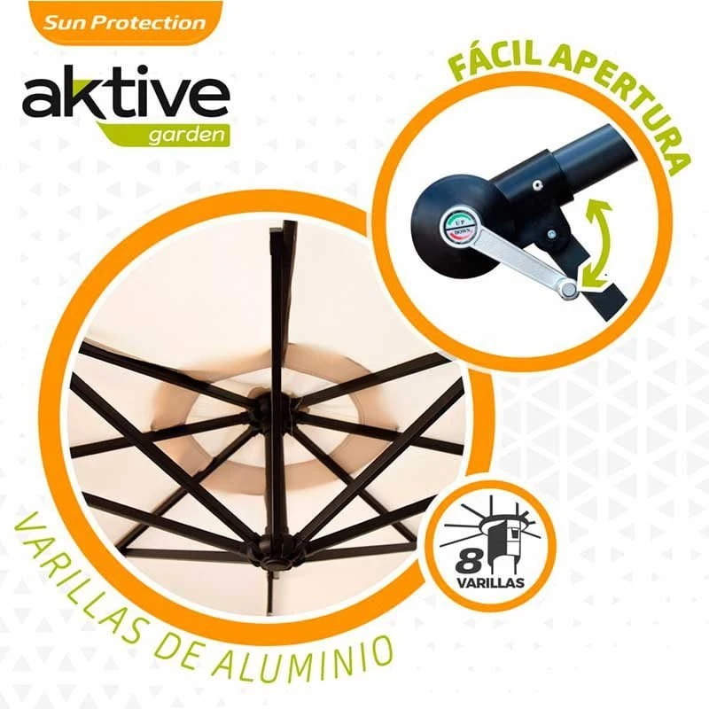 Podrás crear una zona de sombra perfecta para pasar el rato con este parasol cuadrado modelo Banana de la marca Aktive Garden. Está fabricado en tejido 100% poliéster de 180gr/m² con acabado en color crema. Su estructura está realizada en aluminio con tubo central de 42-48 mm de diámetro. Es muy resistente gracias a las 8 varillas que incluye y al techo tipo chimenea que, además, favorece la circulación del aire. Su montaje es muy sencillo y gira 360º para orientarlo sin tener que moverlo.