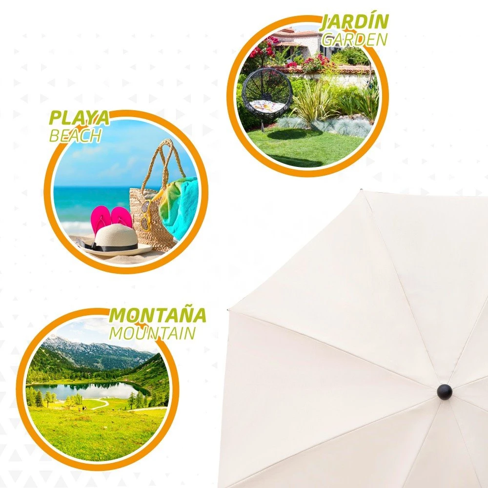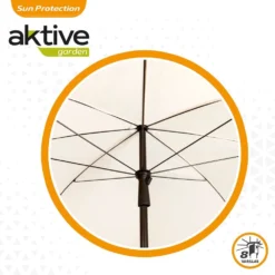Estar protegido del sol mientras disfrutas en la playa y del sonido de las olas es muy fácil con esta sombrilla Aktive Beach. Esta sombrilla está fabricada en poliéster color beige con medidas de 240 cm de arco y 230 cm de altura, con un revestimiento de aluminio para proteger de los rayos del sol UV30. El mástil es de aluminio con un diámetro de 28/32 mm y cuenta con 8 varillas que se pueden abrir y cerrar fácilmente con el botón. Para poder regular la altura incorpora una rosca, además en la parte superior dispone de un sistema de inclinación para poder dirigir la sombra. Gracias a su funda puede transportarse y guardar con comodidad.