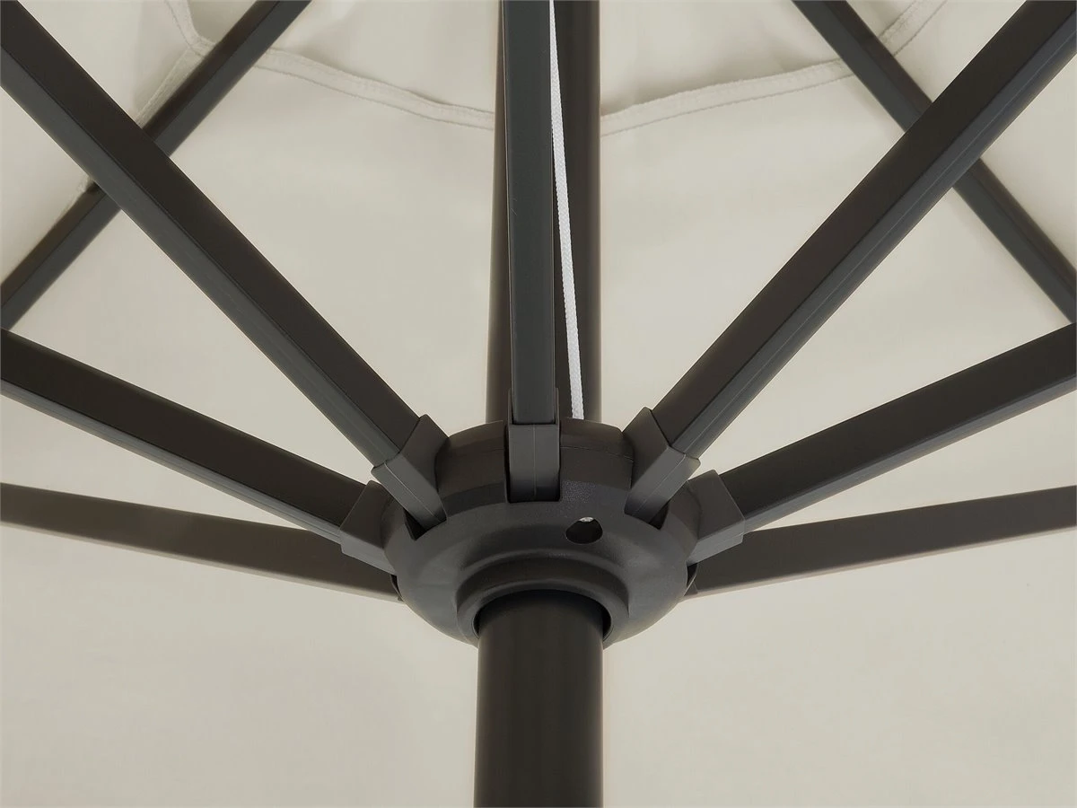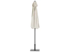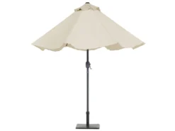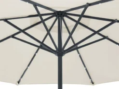 Sombrilla de jardín. Añade un toque de elegancia a tu zona exterior con esta sombrilla de jardín. Está fabricada a partir de poliéster duradero, impermeable y resistente a las manchas. El poste de metal viene con una manivela que facilita la apertura y el cierre. Las luces LED en las barras transversales aportan una luz suave y acogedora por la noche. Detalles: Tipo de Producto: Sombrilla Estilo: Moderno Color: Beige Tonalidad: Beige claro Tipo de material: Metal Material principal: Poliéster Material adicional: Aluminio Composición del Material: 100% Poliéster Forma: Octagonal Rotación 360: No Placas: No LED: Sí Número de láminas: 8 Láminas: 8 Inclinación: No Mecanismo de abertura de la sombrilla: Manivela Dimensiones: Profundidad: 266 cm Ancho: 266 cm Diámetro del poste: 38 Altura: 240 cm Peso: 7 kg La oferta incluye: 1 x Sombrilla, No incluye: base, No incluye: pilas Ventajas: Mecanismo de abertura por manivela, Llamativa iluminación LED que crea un ambiente agradable, Construcción muy estable, UPF 30+ (filtra el 96,7% de la radiación UV, Funciona con 3 pilas AA Información de montaje: Requiere montaje parcial. 5-15 min. Información adicional: Debe tenerse en cuenta que el peso ideal de la base para la sombrilla es de unos 50 kg. De esta forma, la sombrilla podrá soportar vientos de hasta 25 km/h. Una vez que la sombrilla esté completamente cerrada o abierta, no continúes girando la manivela en la misma dirección, ya que podrías dañar el mecanismo. Texto de resistencia: El producto está hecho con tela resistente a los rayos UV, lo que significa que se puede usar bajo la luz del sol sin preocuparse por la pérdida de color. En cualquier caso, es recomendable colocar los muebles debajo de una cubierta impermeable cuando no se utilicen, para asegurar su máxima durabilidad. Resistencia: Rayos UV Consejos de mantenimiento: Poliéster: 1.Limpiar con champú seco y una esponja húmeda o un limpiador suave 2.Cuando no esté en uso, manténgalo en un lugar limpio y seco para protegerlo de las condiciones atmosféricas 3.Aspire con un accesorio adecuado. Aluminio: 1.Limpiar con agua jabonosa y detergentes suaves. Quitar el polvo con un paño suave 2.Fuera de temporada, utilice una funda protectora o guarde los muebles en un lugar fresco y seco.