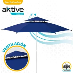 Sombrilla para jardín Aktive Beach. El parasol es de 280 cm con tubos de metal de 28/32 mm regulables en altura. Tejido 100% poliéster de 160 gr/m2 en color azul marino con 6 varillas de fibra de vidrio y protección solar UV35 +. Su doble techo favorece la circulación del aire en días de viento y repele el agua. Incluye bolsa tipo saco con asa para su transporte y guardado.