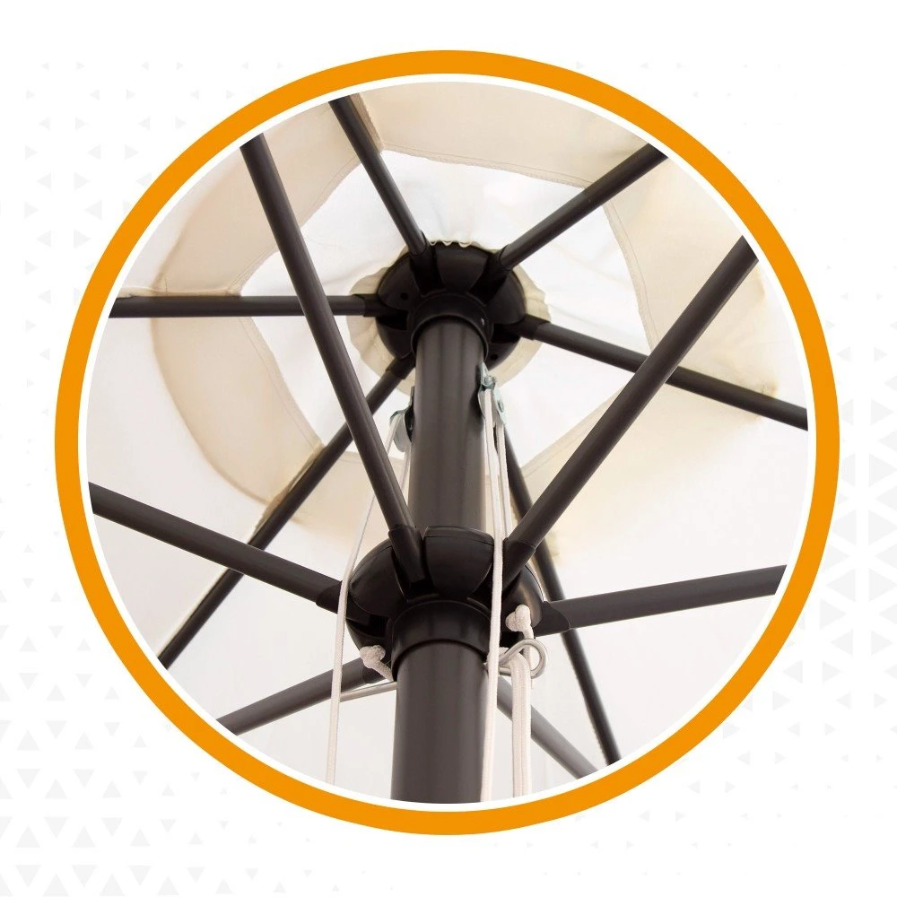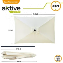 Parasol rectangular color crema de 300 x 200 cm Aktive Garden, ideal para protegerse de los rayos del sol durante todo el año. Mide 2,5 metros de alto y tiene una estructura de aluminio color antracita con mástil fijo de 38 mm de diámetro y 6 varillas que dan soporte a la tela. El tejido está fabricado de poliéster de 160 gramos y cuenta con protección UV50. Incluye un sistema de chimenea antiviento en el techo para facilitar la circulación del aire en días de viento moderado y para ayudar a evitar la acumulación de calor en su interior. Se abre y se cierra mediante un sistema de doble polea con gancho de seguridad.