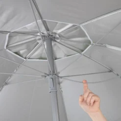 Sombrilla playa antiviento de alta calidad Max Air de Aktive Beach. La sombrilla tiene forma octogonal y cuenta con diseño color azul y con mástil color gris. Su arco es de 200 cm de diámetro y su mástil de altura regulable tiene 28/32 mm de diámetro. La sombrilla está fabricada con tejido de poliéster, cuenta con revestimiento plateado con protección UV50 y su mástil es de aluminio. Una de las características que la hacen especial es su resistencia frente al viento gracias a la ventilación en la parte superior y a sus 8 varillas flexibles fabricadas con fibra de vidrio. Además, su mástil de alta resistencia es inclinable, por lo que la sombrilla se puede orientar según la posición del sol. Incluye bolsa de almacenamiento y transporte a juego con asa de hombro.