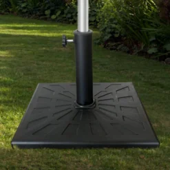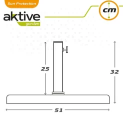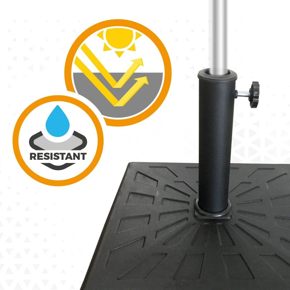 Soporte para sombrilla Aktive Garden cuadrado de poliresina con medidas de 51×51 cm y 32 cm de alto. La pieza pesa 19 kilos. Diseño funcional en negro con tubo de acero. Fabricada con material resistente al agua y a los rayos de sol. Ideal para asegurar la estabilidad y sujeción de tu sombrilla frente al viento. Apto para sombrillas con mástil de 38 y 48 mm, con rosca ajustable.
