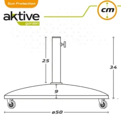 Soporte para sombrilla Aktive Garden en cemento con 4 ruedas con freno y medidas de 50 cm de diámetro y 38 cm de alto. La pieza pesa 25 kilos. El diseño es funcional e incluye tubo de acero para anclar el mástil apto para sombrillas con mástil de 35 y 48 mm, con rosca estable. Los materiales son resistentes al agua y al sol. Ideal para asegurar la estabilidad y sujeción de tu sombrilla frente al viento.