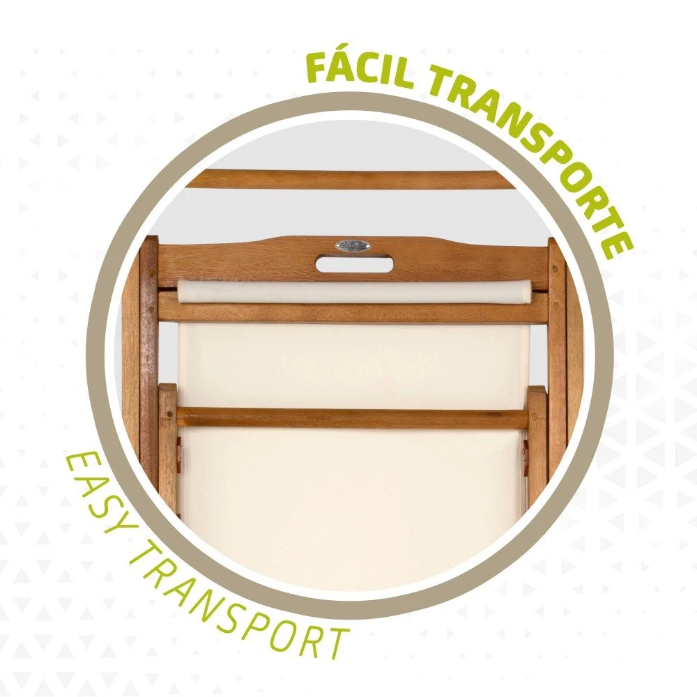 Tumbona de jardín Aktive Garden en madera de acacia de origen sostenible y asiento en poliéster color crudo. Estructura resistente y estable, se pliega de forma sencilla para guardarla o transportala cómodamente. Respaldo regulable en 3 alturas. Mide 59x106x94 cm. Ideal para interior y exterior. Diseño elegante y materiales de fácil limpieza y mantenimiento.
